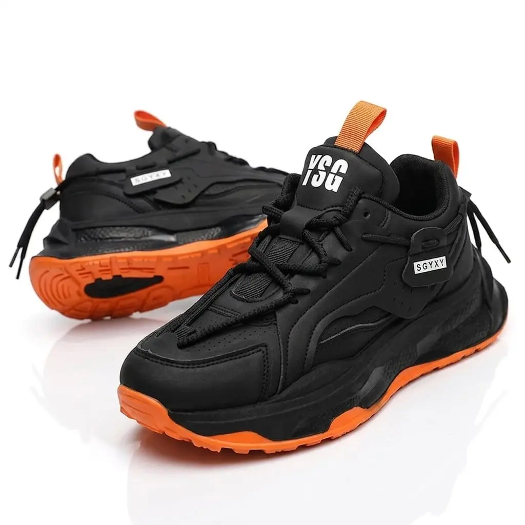 حذاء رياضي عصري بتصميم جريء يجمع بين اللون الأسود الأنيق ولمسات البرتقالي القوية